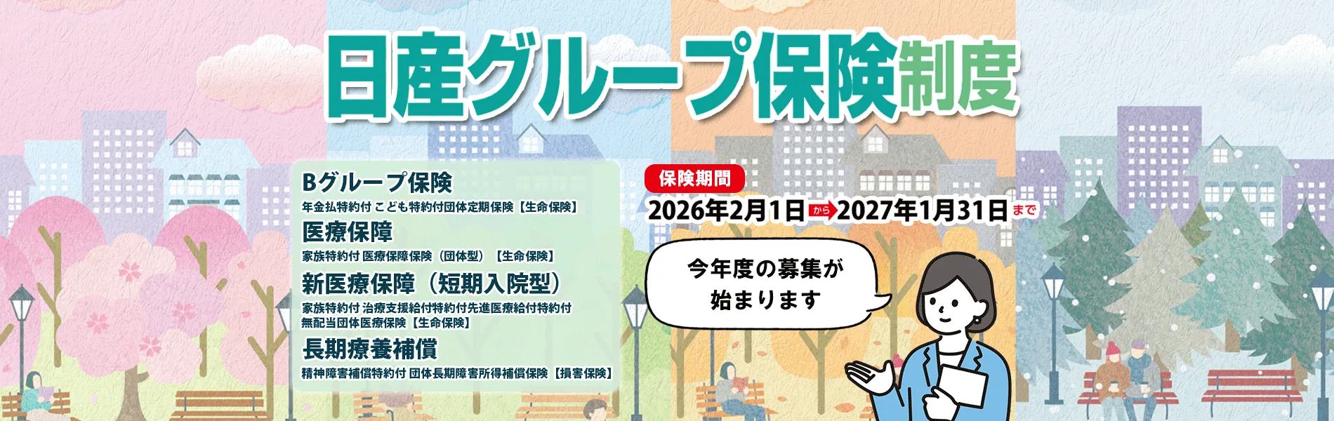 アイコンリンク個人掛保険 傷害総合補償がん補償/子供補償Bグループ保険医療保障新医療保障(短期入院型)長期療養補償ニューエイジ アイコンリンク会社掛保険 企業総合補償制度包括自動車保険制度サイバー保険制度売上代金総合補償制度日産圏ディーラーPL保険施設所有管理者賠償責任保険 アイコンリンク物販商品 安全靴軍手電気絶縁手袋ポケットティッシュ電気絶縁手袋ゼンリン地図 他 日産グループサービスからのお知らせBグループ保険・医療保障・新医療保障(短期入院型)・長期療養補償・ニューエイジの定期展開が始まります。 新型コロナウイルス感染症の5類移行に伴う取扱いについて 「みんなのMYポータル」サービスについて保険金請求はこちら各種請求書・帳票退職予定の方向け東京ビュック宿泊料金表